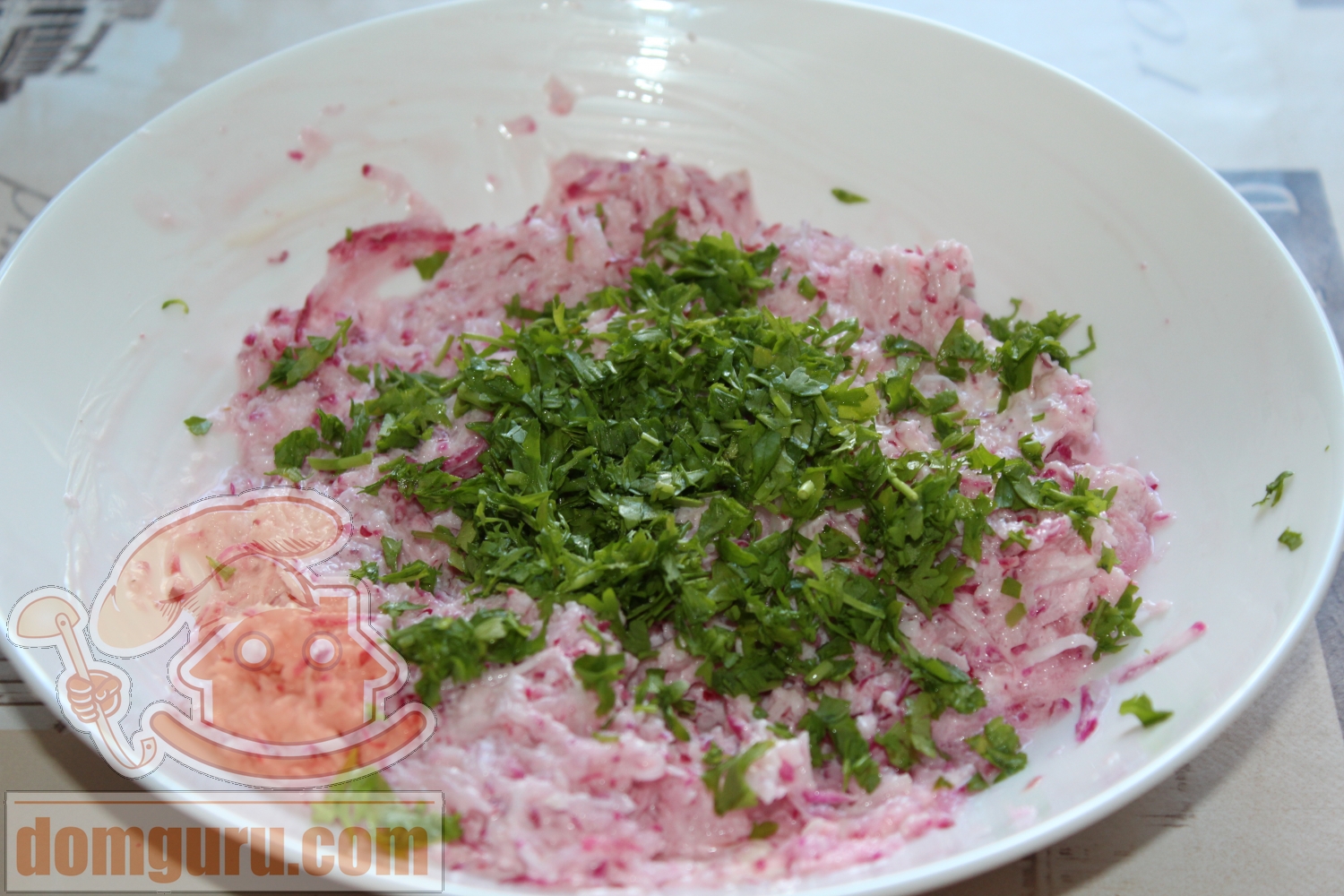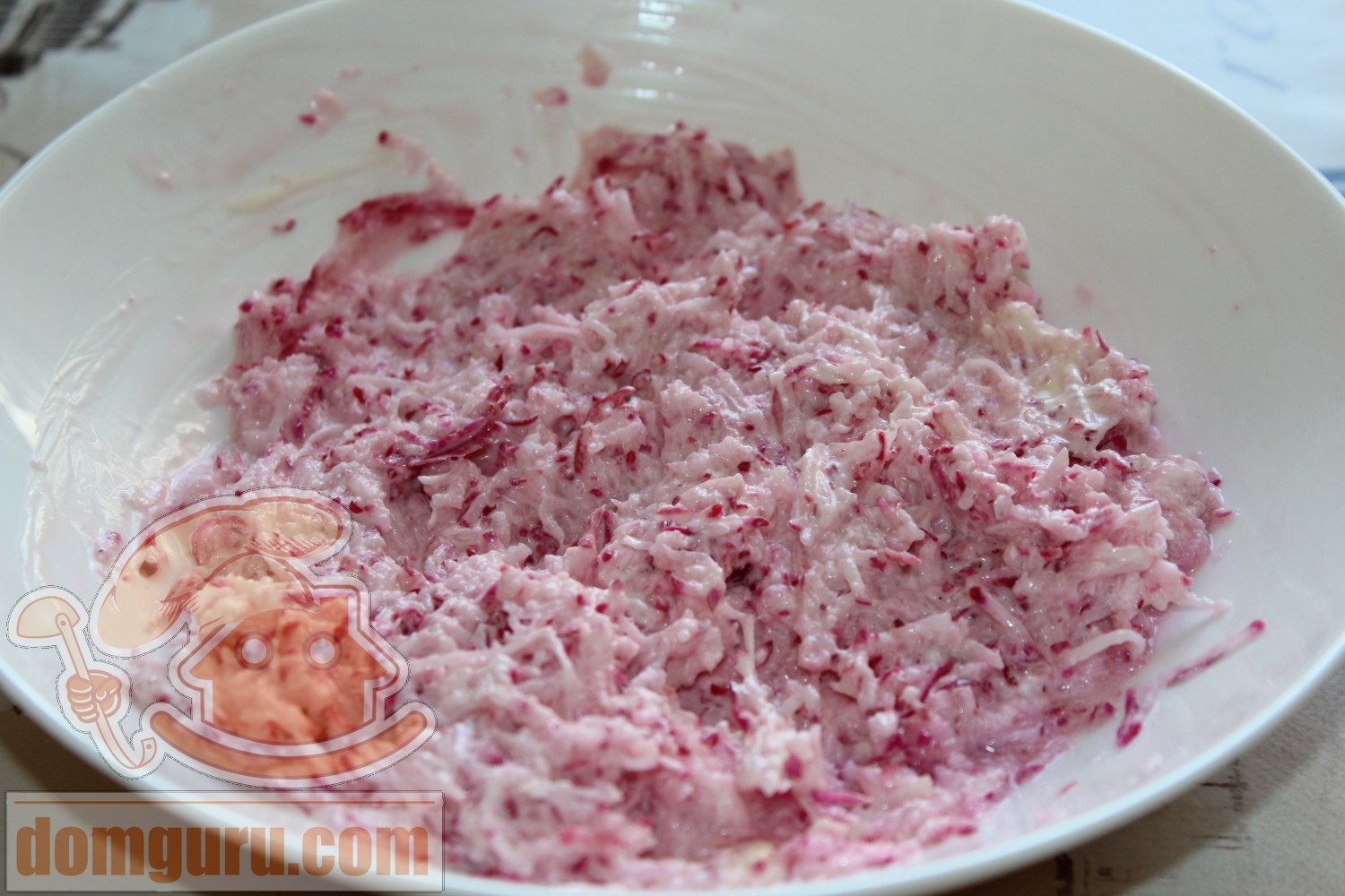 Заправьте редис майонезом.