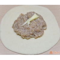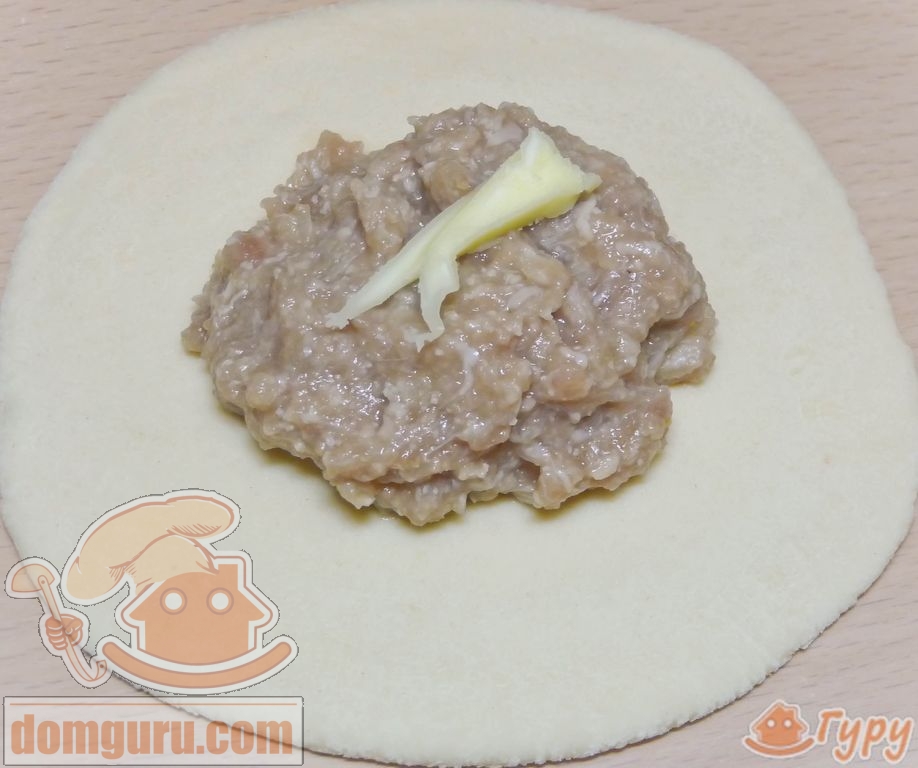 На каждую лепёшку разложите фарш, сверху положите по кусочку сала или сливочного масла.