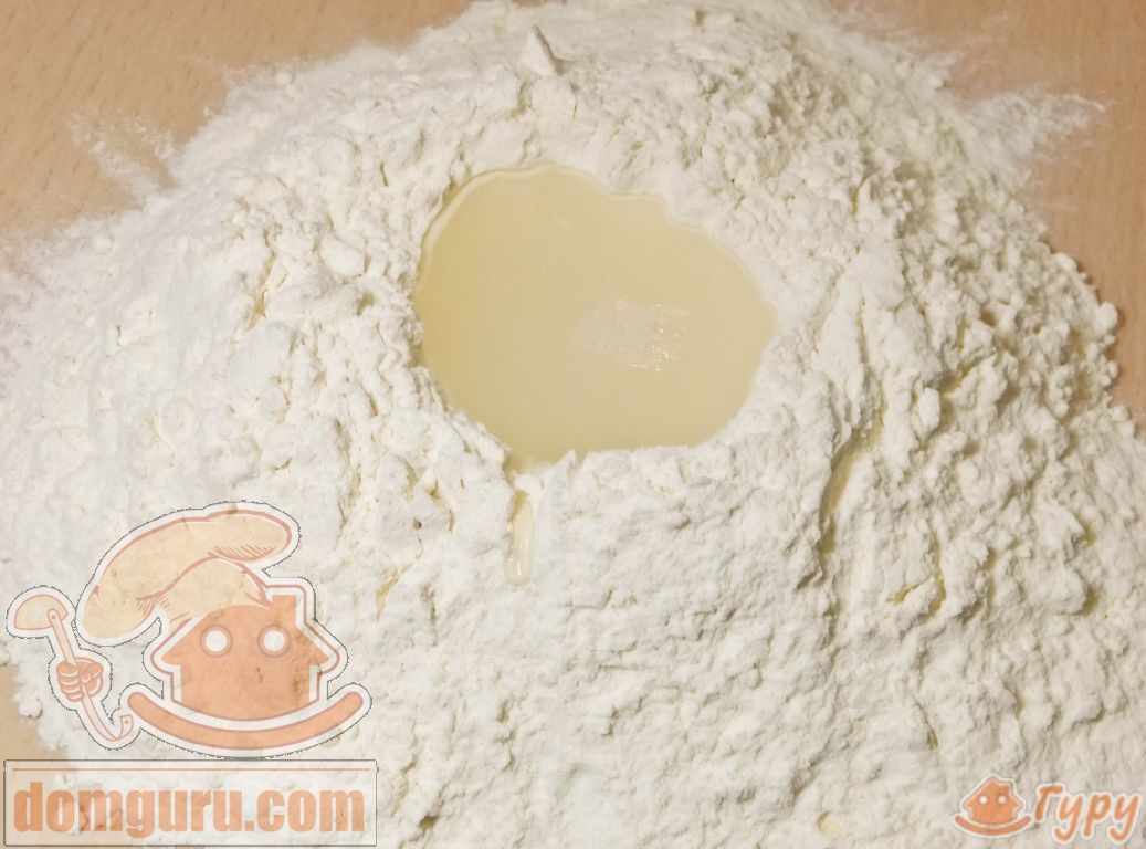 Для приготовления теста муку на столе соберите горкой, сверху сделайте лунку и влейте в неё подсоленную воду.