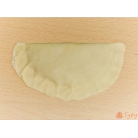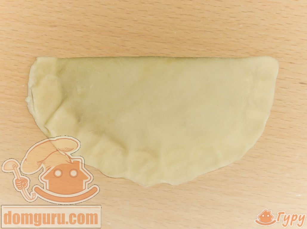 Теперь нужно вновь вернуться к фаршу: замешиваем в него лук, зелень, перец, соль и заливаем бульон. Готовый фарш раскладываем на серединки лепёшек, которые предварительно скалкой необходимо довести до нужной степени тонкости. Лепёшки аккуратно сгибаем пополам, стараясь не порвать. Края надо красиво и плотно защипнуть, а затем обрезать, чтобы они стали ровными.