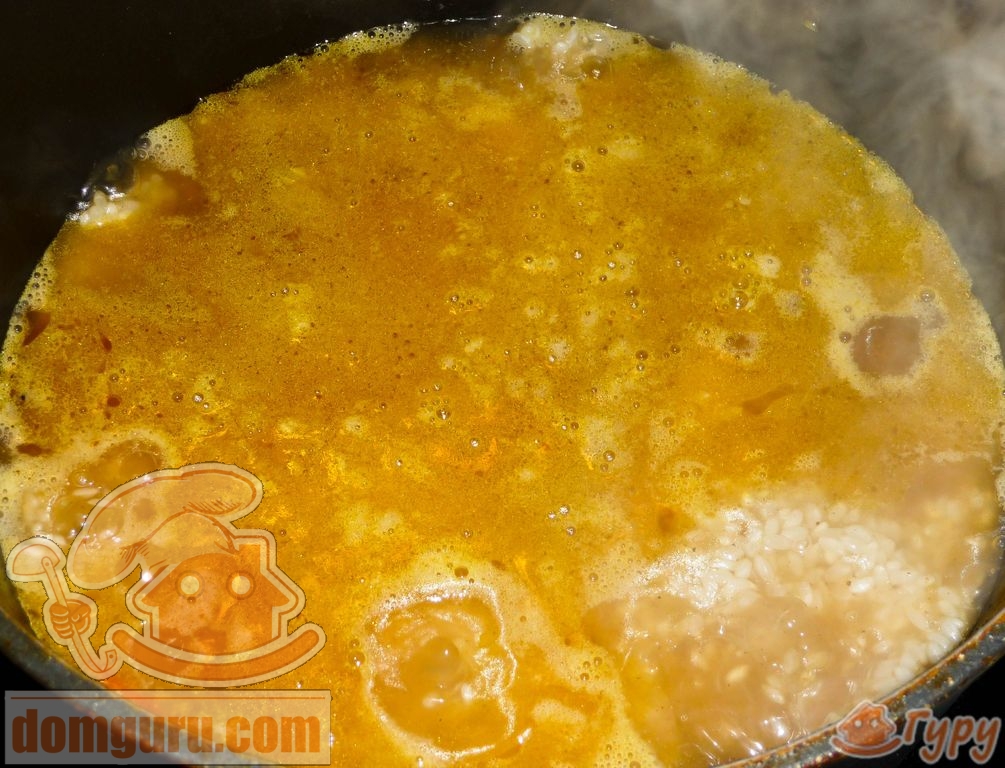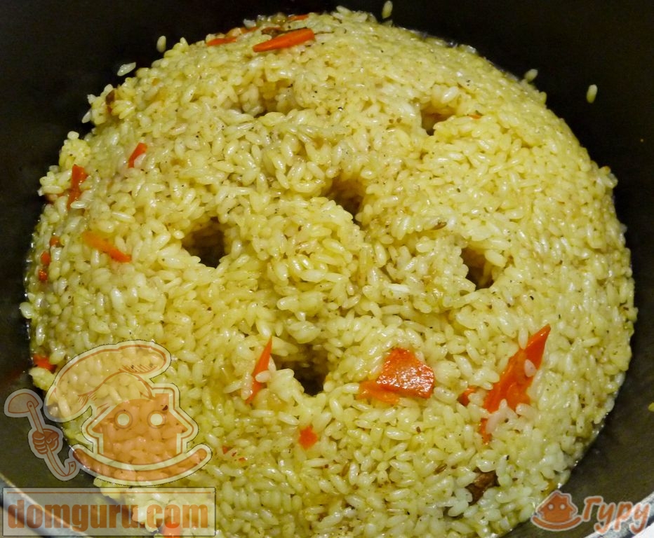 Сверху осторожно, тонкой струйкой лейте кипяток, пока рис не будет покрыт слоем 1 — 1,5 см. Плотно закройте казан крышкой на несколько минут.