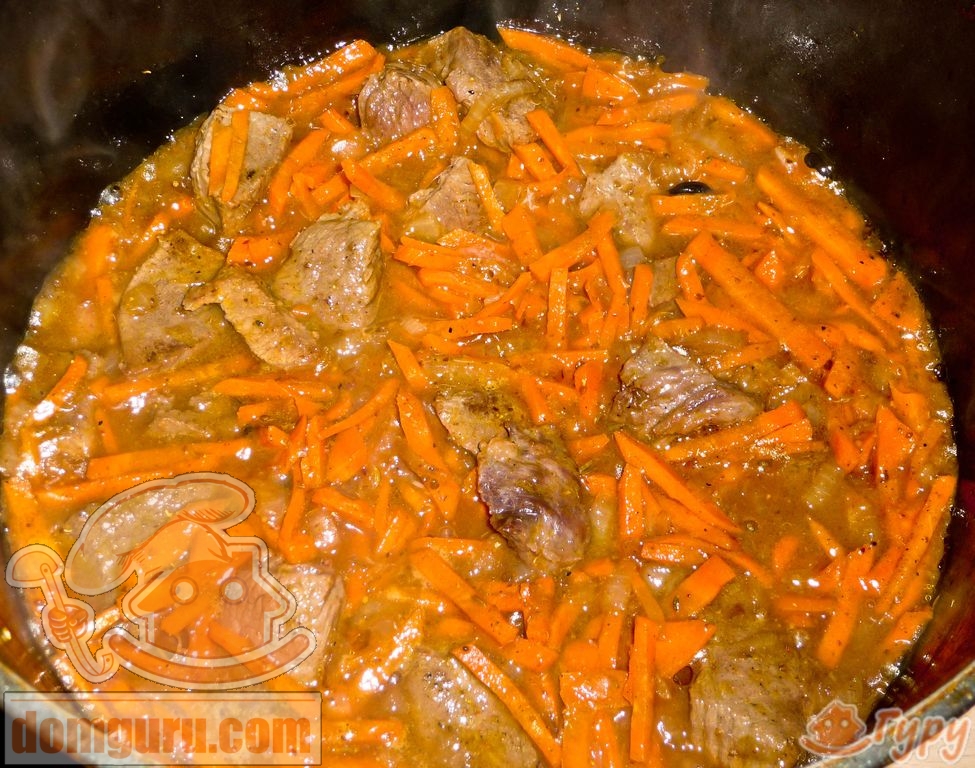 Всё это время огонь должен быть достаточно сильным, и вы должны постоянно помешивать содержимое казана, чтобы оно не подгорело. Когда морковь поджарится, добавьте пряности, соль и пол стакана кипятка. Вся эта стадия приготовления должна занять около 20—25 мин.
