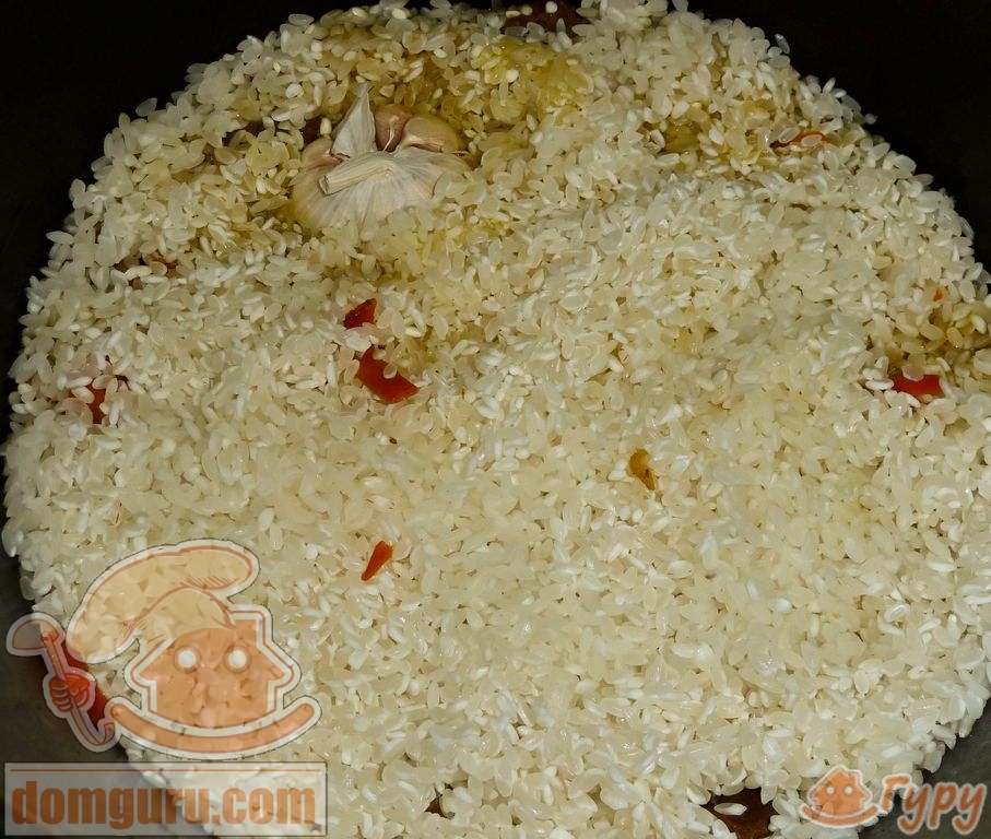 Чеснок очистите только от верхней шелухи, оставляя головку целой, затем тщательно промойте. Вскипятите воду. Чеснок можно класть по желанию, его нужно добавлять в рис, когда выпарится вода в горку из риса.
