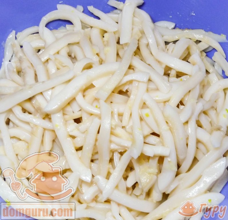 Основным условием приготовления салата является то, что кальмары заправляются без промедления. Специи необходимо добавлять в горячие кальмары, тогда они приобретают белую окраску и способны впитать в себя все специи.
