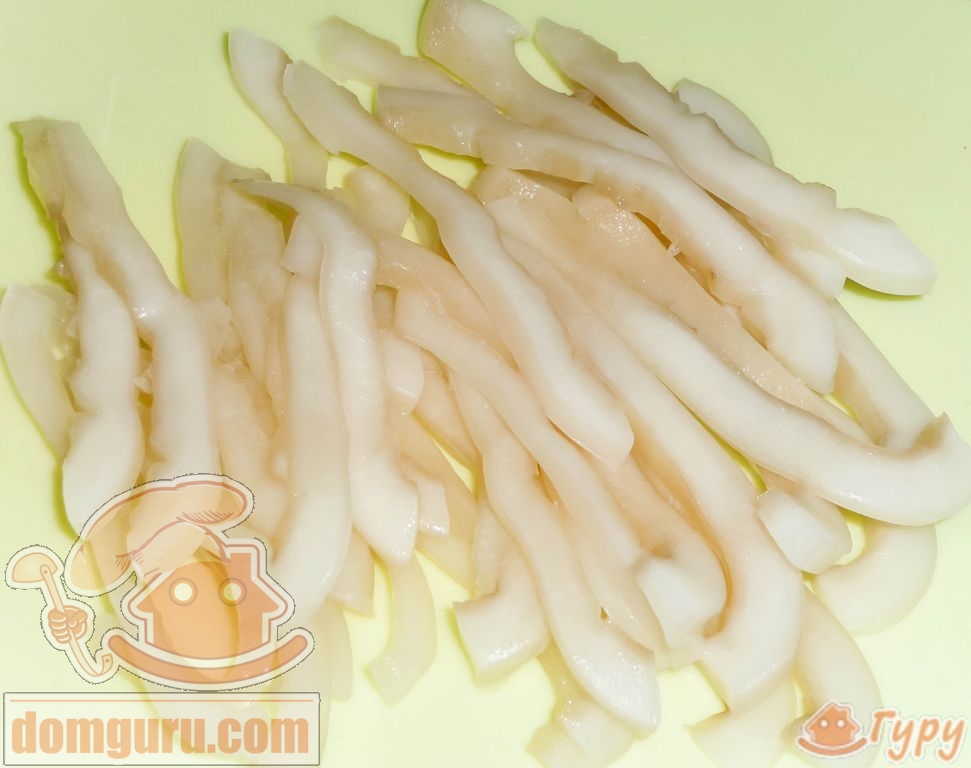 После чего выньте кальмары из воды и тут же нарежьте полосками шириной 5 мм.