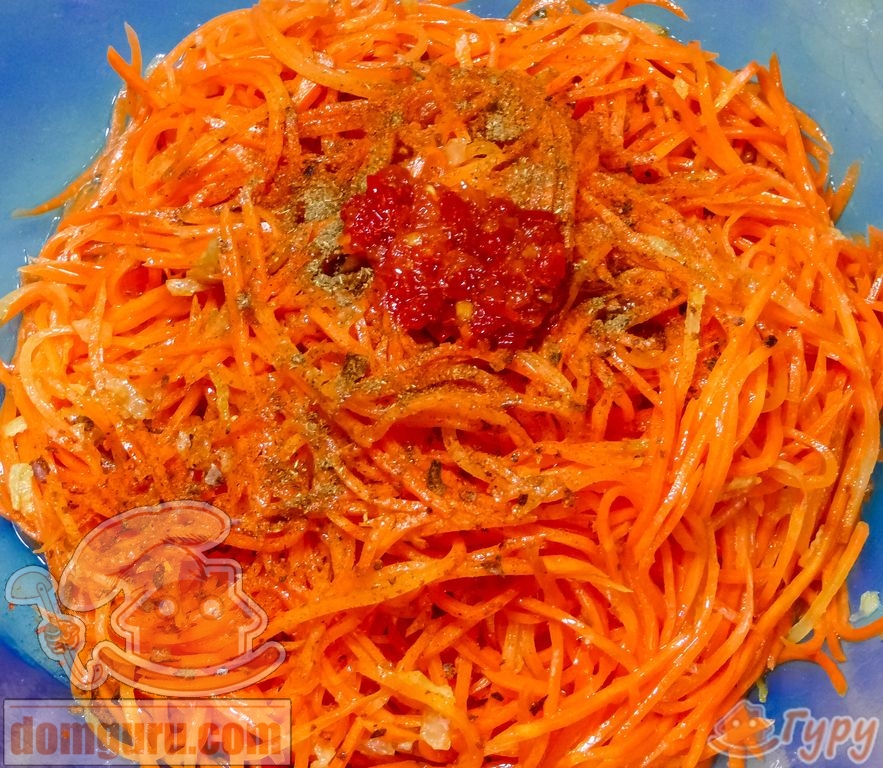 Перед тем, как заправить морковь, промойте её в холодной воде, затем откиньте на дуршлаг. Промытую морковь отожмите и соедините с приготовленной зажаркой. Добавьте в салат уксус, сахар, сухую кинзу, глютамат натрия, измельчённый чеснок, чёрный и красный перец. Морковь со специями перемешайте, при необходимости добавьте соль.