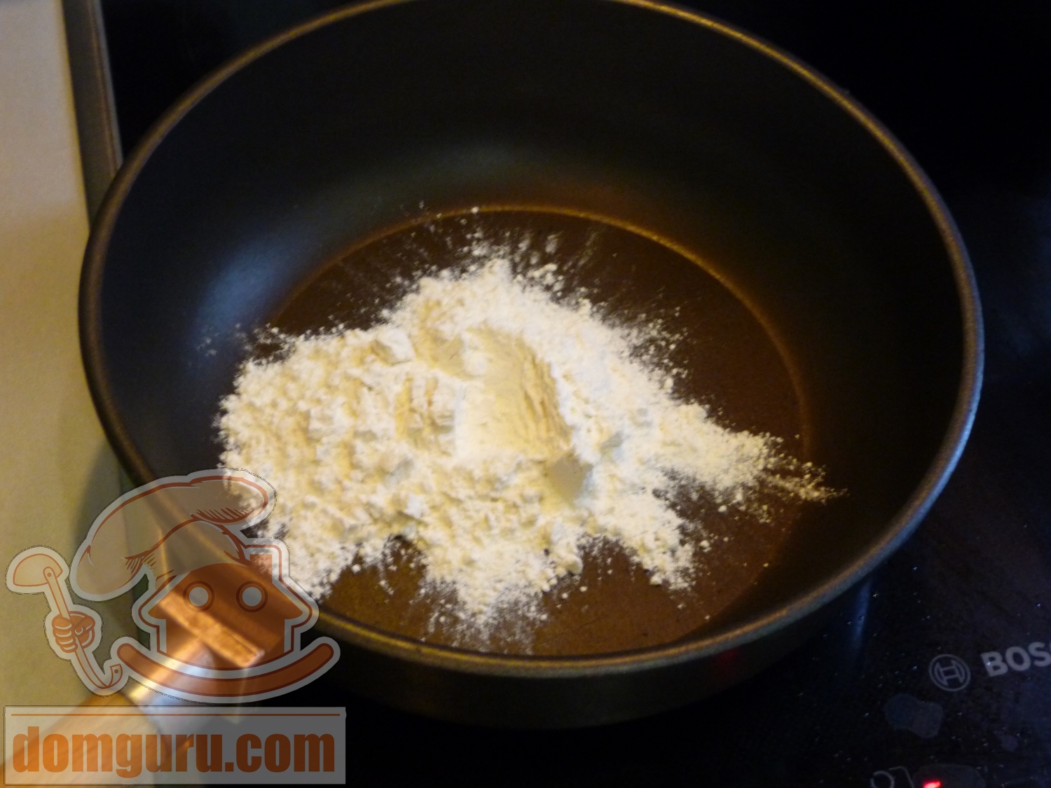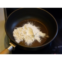 Отдельно насыпьте в сухую сковороду муку и обжарьте её без масла до светло-коричневого цвета.