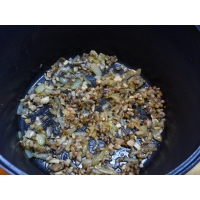 В отдельную сковороду налейте масла, обжарьте лук и грибы. Посолите и поперчите.
