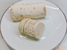 Аккуратно сверните лаваши в рулет, и уберите в холодное место, чтобы рулет как следует пропитался.