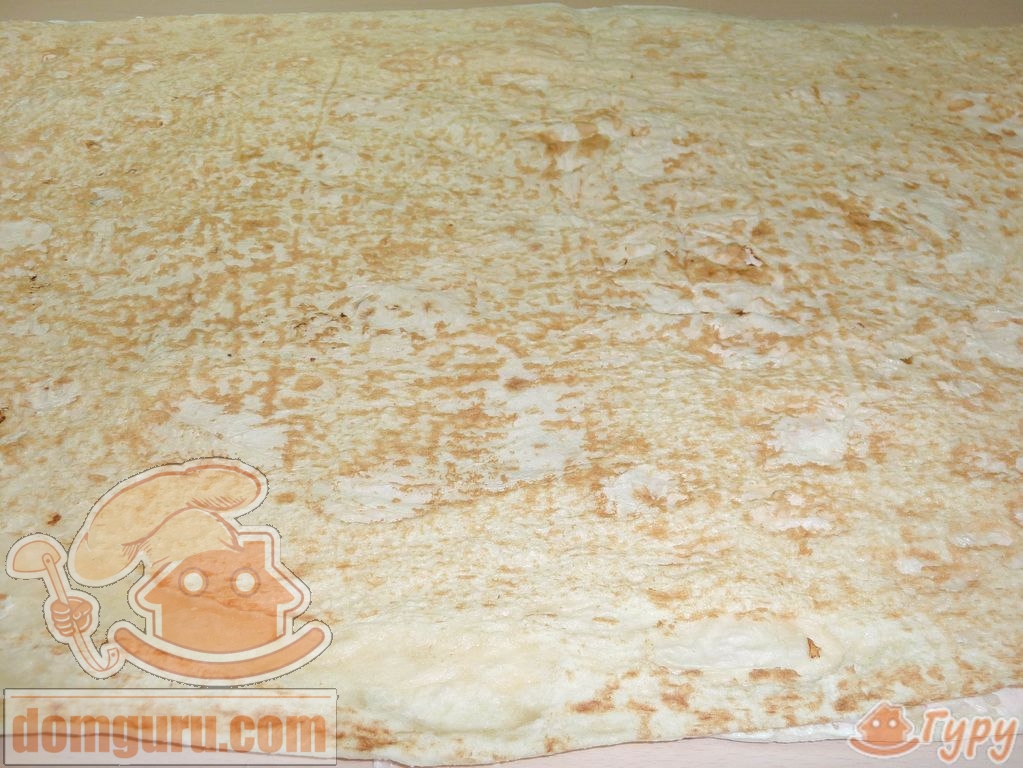 На смазанный лаваш расстелите второй лаваш такого же размера. Смажьте второй лаваш смесью плавленного сыра с майонезом.