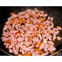 Для приготовления омлета колбасу и сосиски нарежьте небольшими кусочками. Разогрейте в сковороде растительное (или сливочное) масло и обжарьте на высоком огне сначала сосиски.