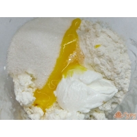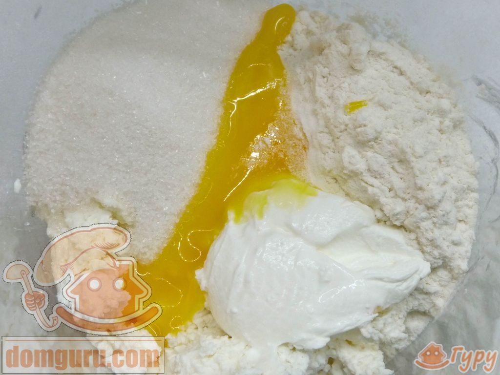 Приготовьте для сочников тесто и творожную начинку. Для приготовления начинки смешайте творог с сахаром, сметаной, 2 столовыми ложками муки и 1/2 желтка.