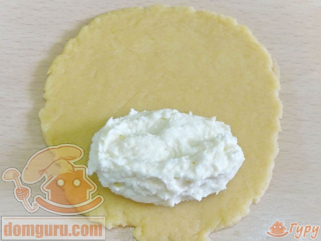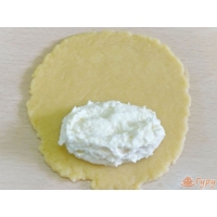 Положите на одну половину раскатанного теста начинку и накройте второй половиной, начинка должна быть видна.