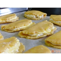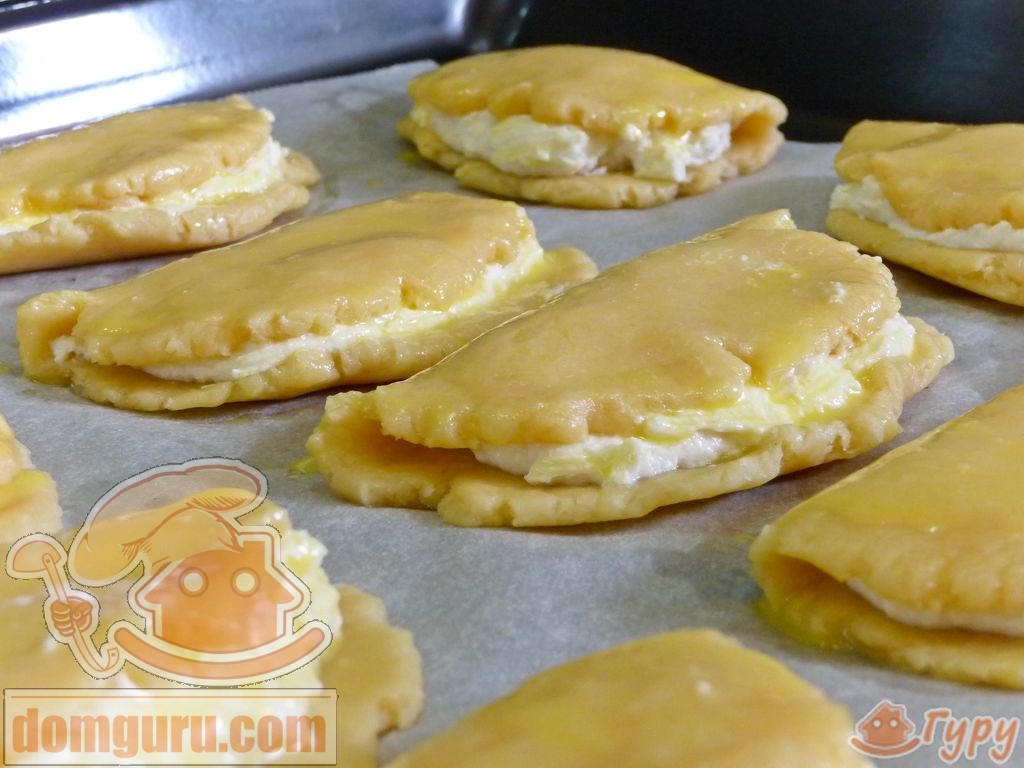Выложите сочники на противень. Смажьте сочники оставшейся половиной желтка, перемешанной с 1 столовой ложкой холодной воды. Запекайте сочники 18-20 минут в духовке при температуре 200 градусов.