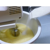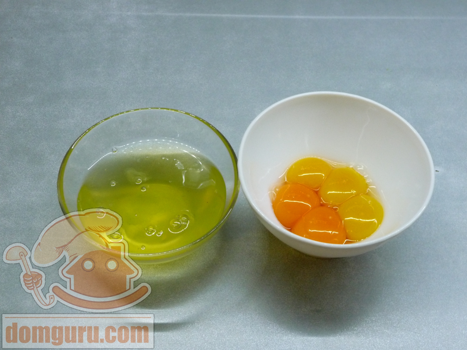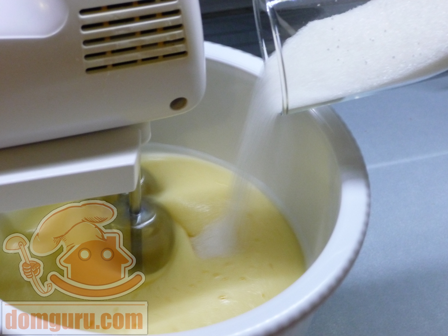Затем добавьте желтки и постепенно засыпьте сахар. Взбивайте яйца до тех пор, пока сахар не растворится.