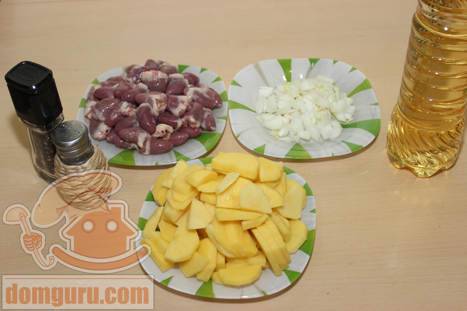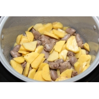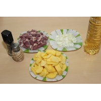 Почистите лук и измельчите его. Куриные сердечки промойте. Картофель очистите и нарежьте кружочками.