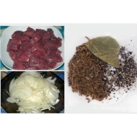 Мясо промойте, нарежьте на небольшие куски. Лук очистите и нарежьте полукольцами. Подготовьте необходимые приправы.