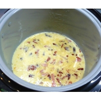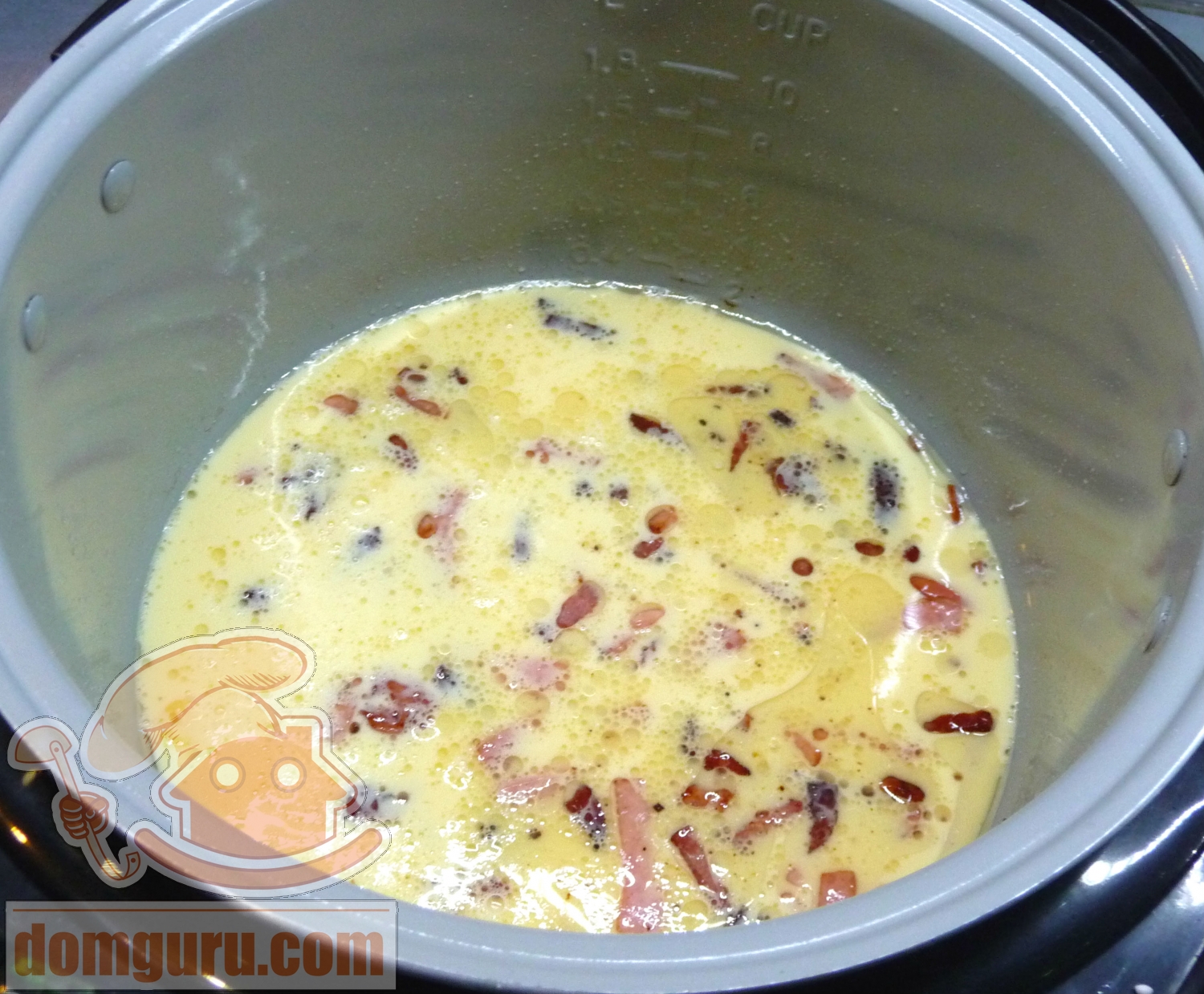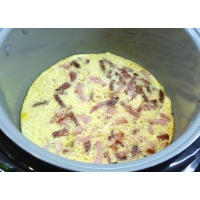 После того как колбаса обжарится, добавьте яйца с молоком и поставьте мультиварку на режим "Выпечка" на 20 минут.