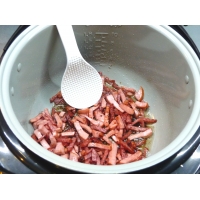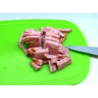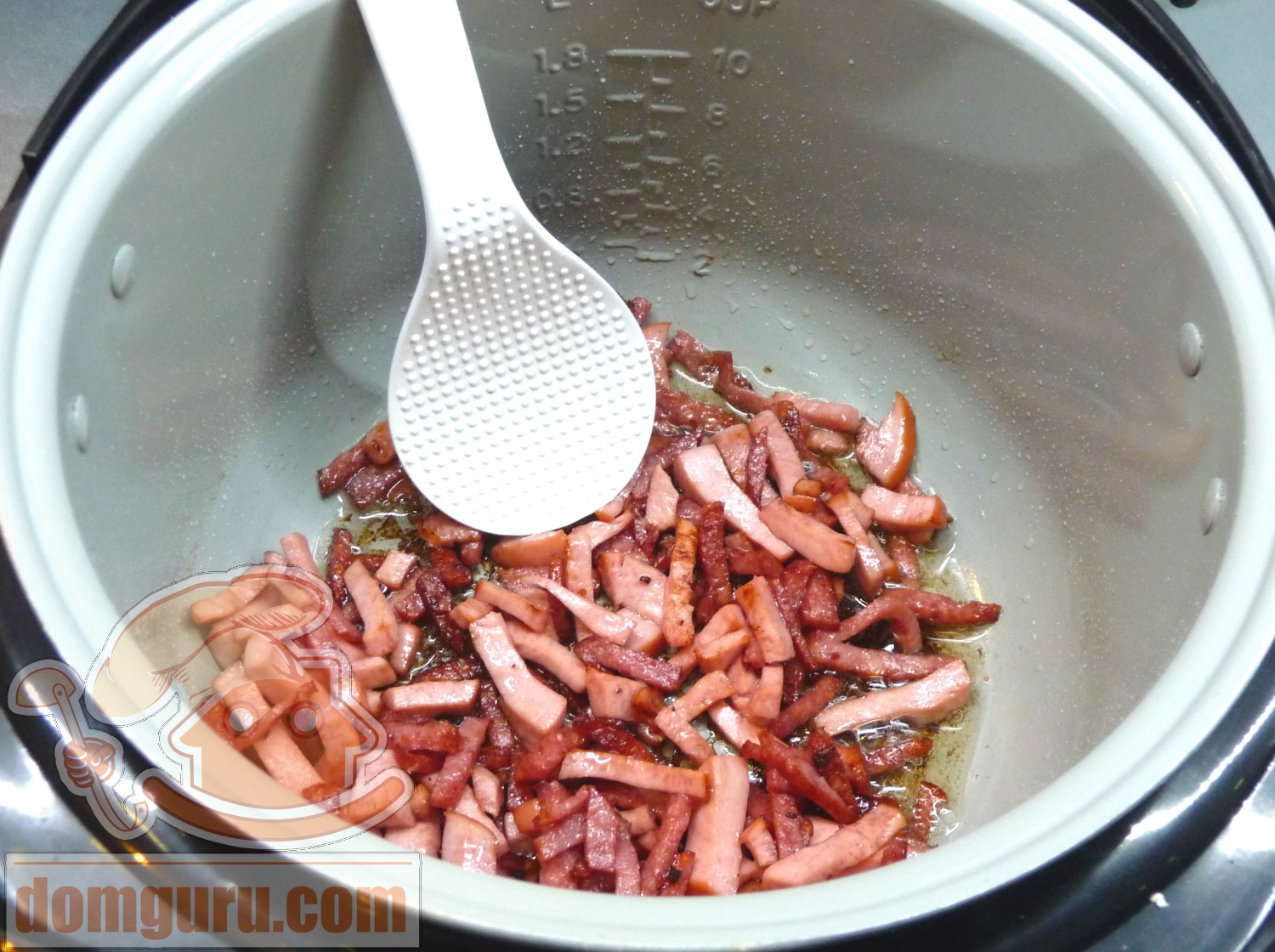 Налейте в мультиварку масло и начните обжаривать колбасу, и варёную, и копчёную.