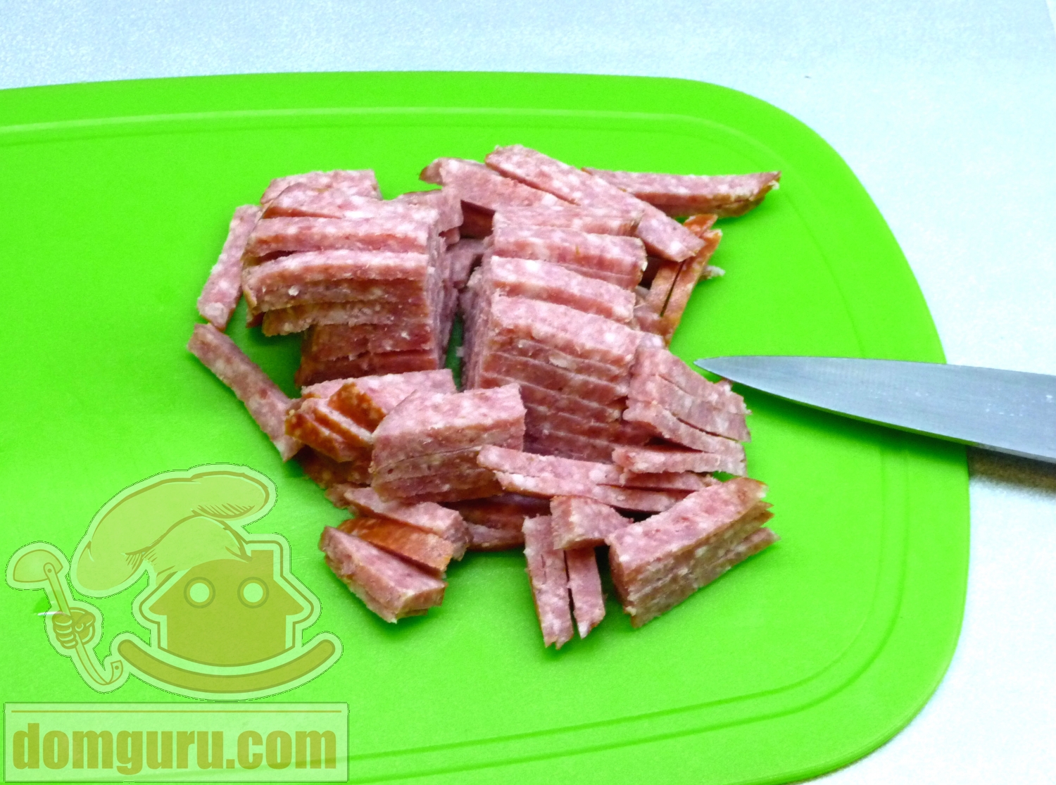 Омлет с варёной и копчёной колбасой подойдет идеально для завтрака.