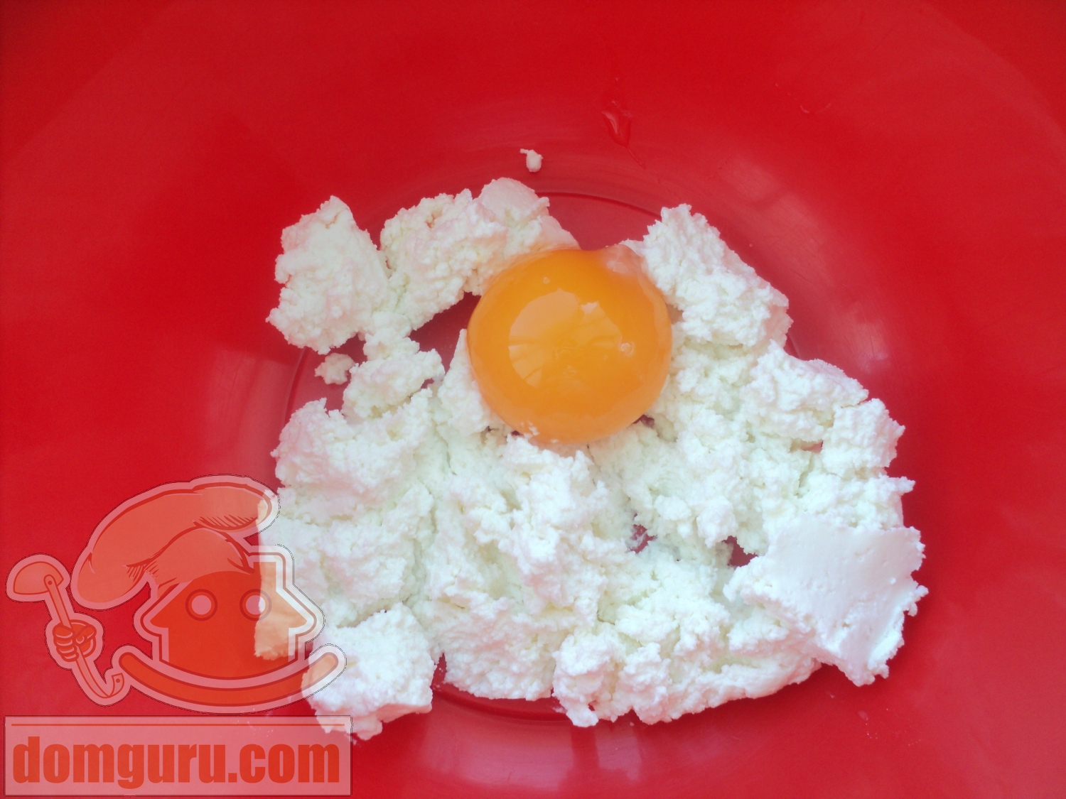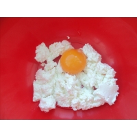 В творог добавьте желток, перемешайте.