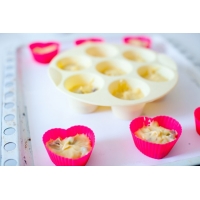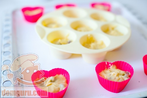 Масло разотрите с сахаром. Добавьте шоколад и яйца. Перемешайте. Затем добавьте муку и разрыхлитель. Всё тщательно перемешайте. Наше тесто готово! В формочки выложите тесто, заполняя их наполовину. Затем заполните оставшееся место кремом. Поставьте в разогретую до 180 градусов духовку и выпекайте 35 минут.