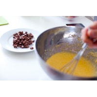 Сначала приготовьте тесто: шоколад поломайте на мелкие кубики.