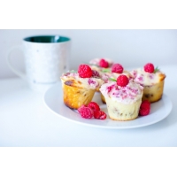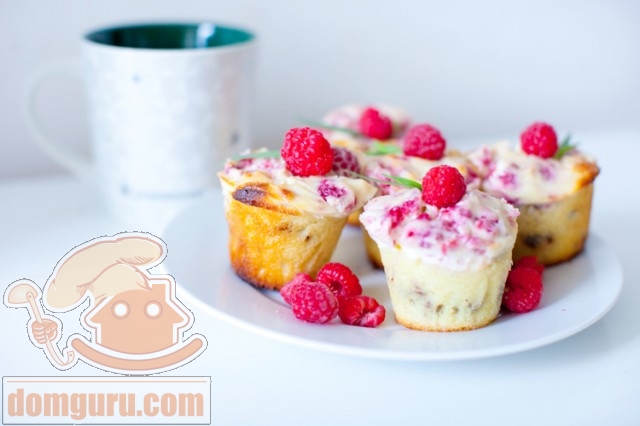 Сверху украсьте наши маффины малинкой, можно также посыпать сахарной пудрой и украсить веточкой мяты. Приятного аппетита!