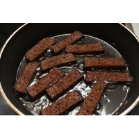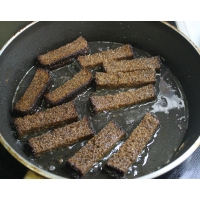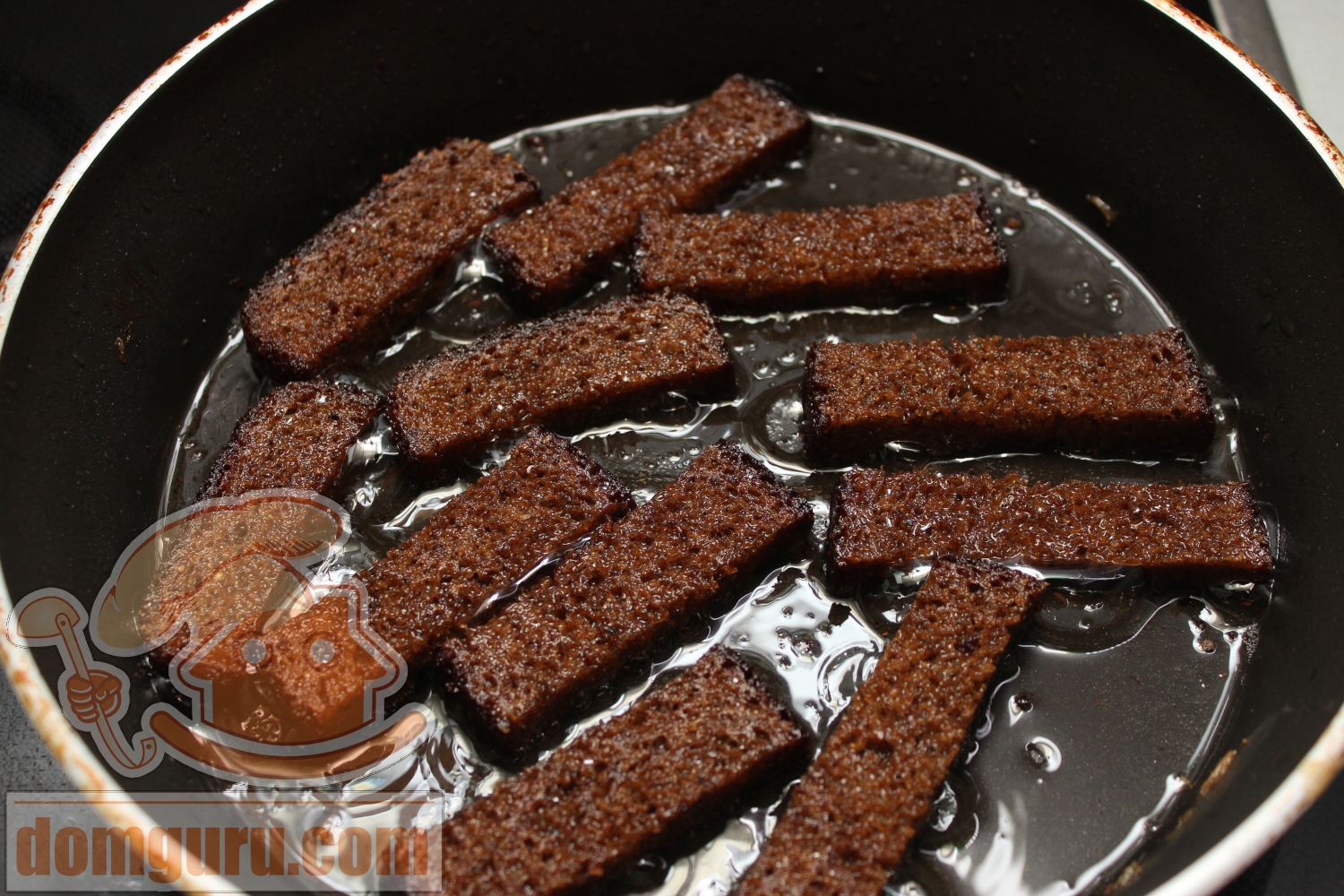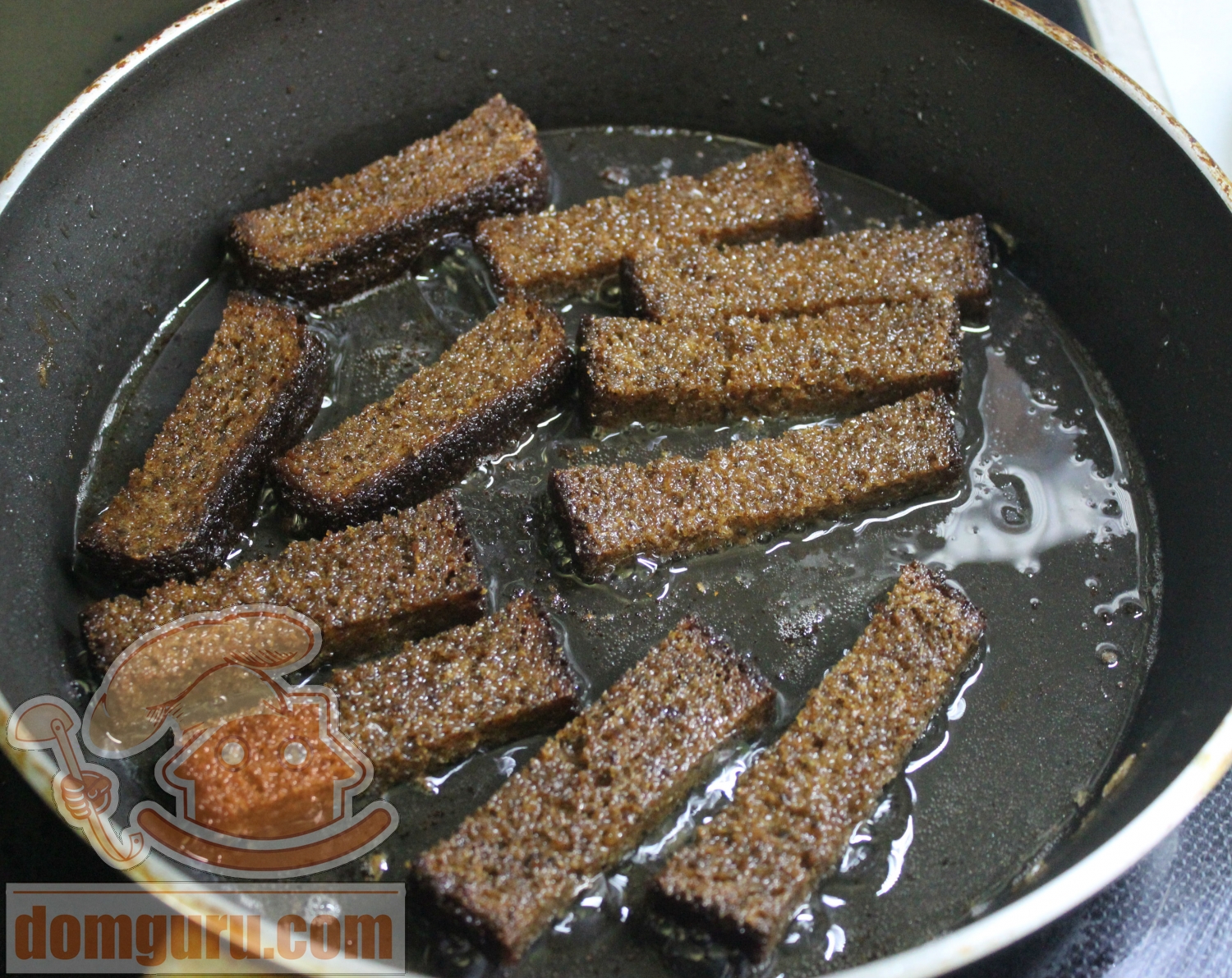 Бородинский хлеб нарежьте соломкой. В сковороду с маслом опустите нарезанный хлеб. Обжаривайте 1-2 минуты на среднем огне.