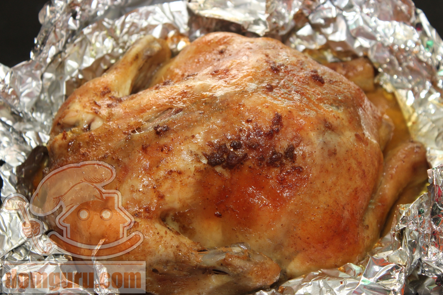 Аккуратно заверните курицу в несколько слоёв фольги. Постарайтесь завернуть курицу так, чтобы из неё не вытекал маринад, и она пеклась в собственном соку. Поставьте в духовку и выпекайте курицу 40 минут при температуре 180 градусов.