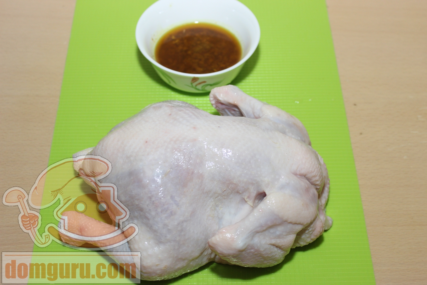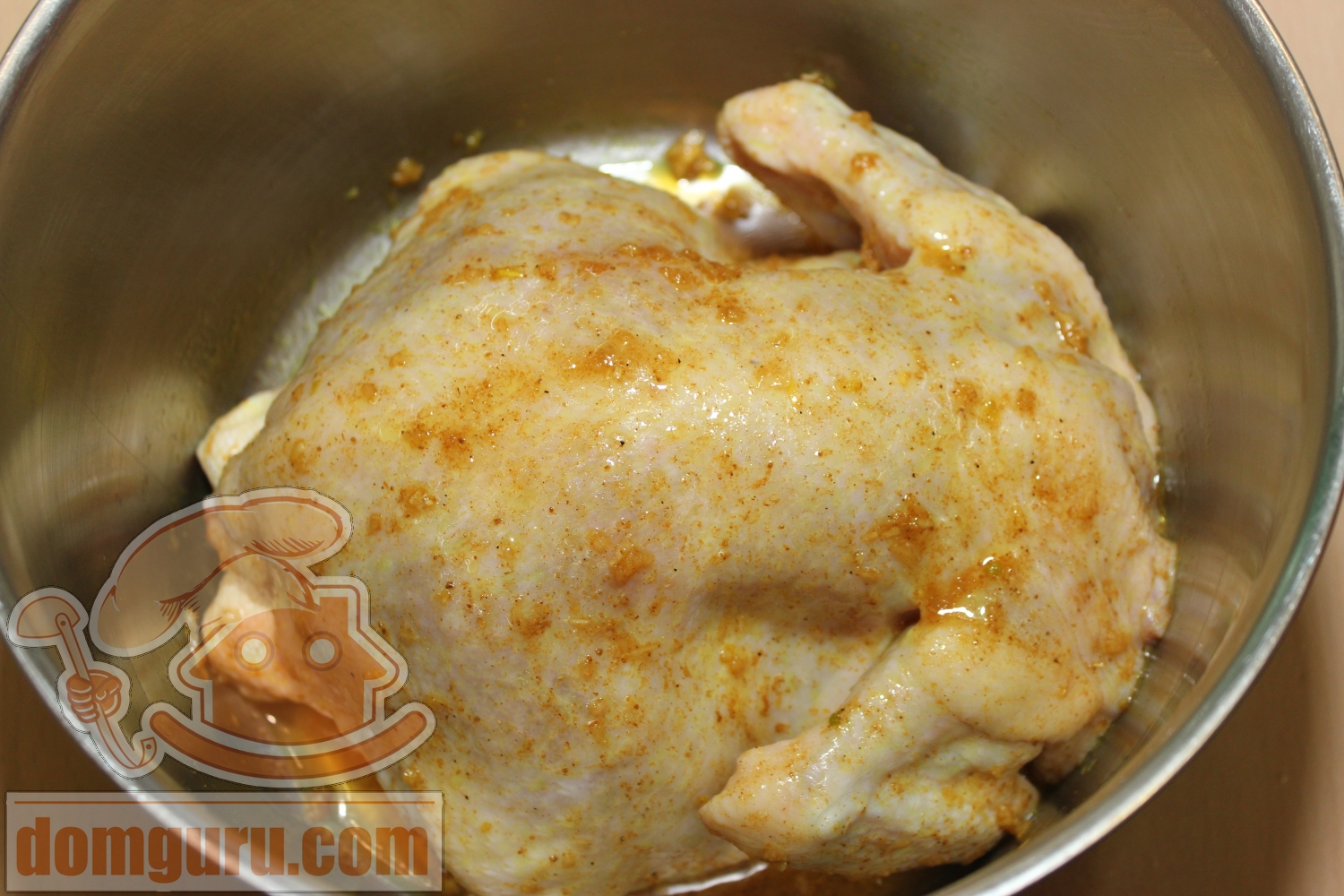 Тщательно натрите курицу маринадом, положите в глубокую кастрюлю и поставьте на ночь в холодильник, чтобы курица хорошенько замариновалась.