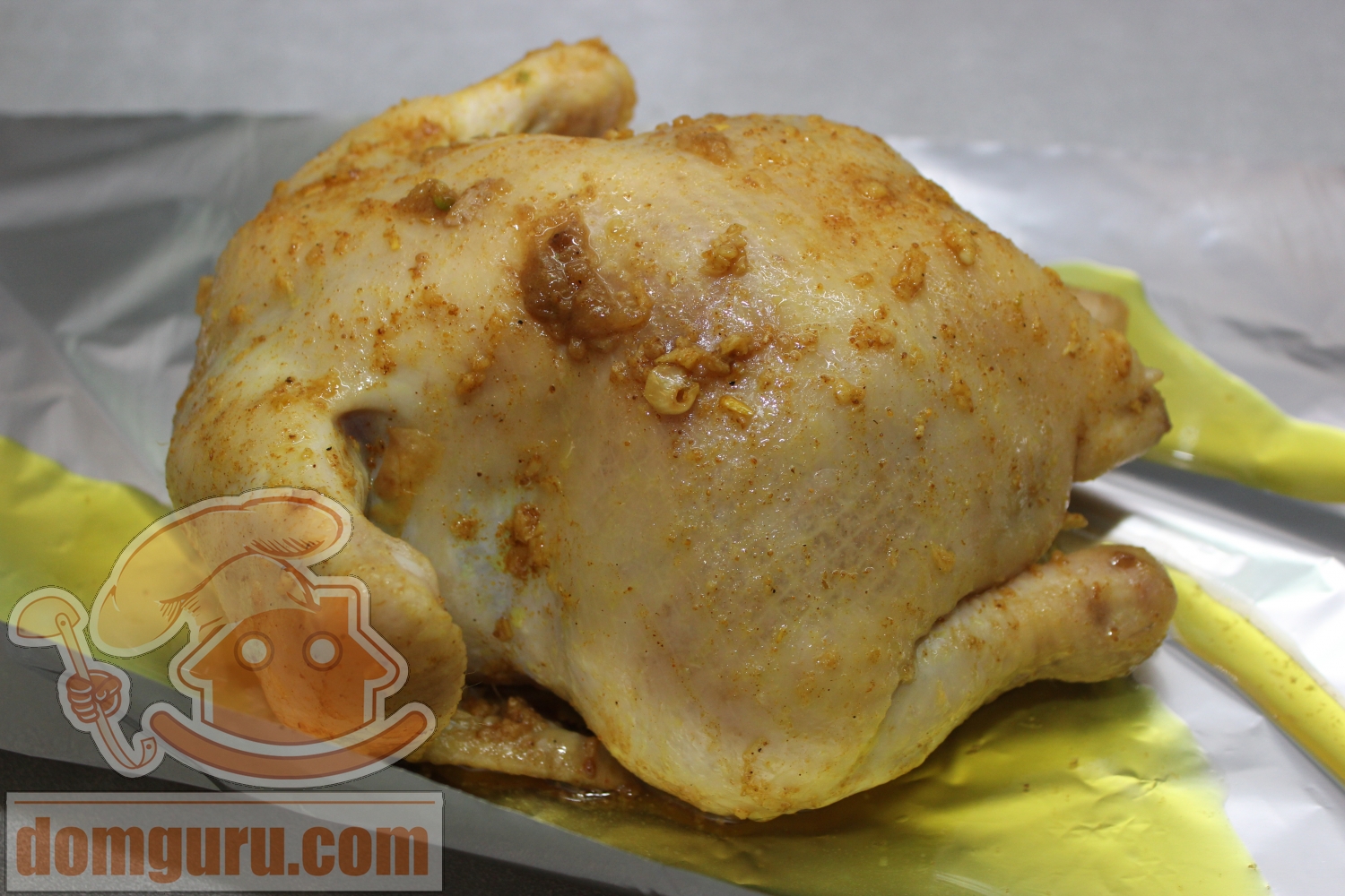 На фольгу аккуратно выложите курицу и полейте её оставшимся маринадом.