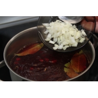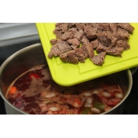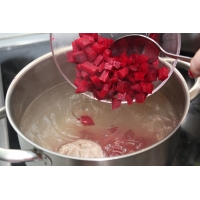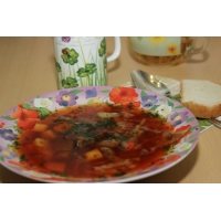 Очистите лук и нарежьте полукольцами, очистите свеклу и нарежьте кубиками, очистите морковь и нарежьте кубиками, очистите картофель и нарежьте кубиками. Капусту нашинкуйте, чеснок очистите, укроп промойте и измельчите. Поставьте вариться бульон, для этого промойте говядину, положите в кастрюлю и залейте водой.