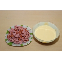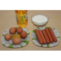Нарежьте сосиски на мелкие кубики. Яйца разбейте в чашу и перемешайте с молоком. Солить не нужно, так как сосиски достаточно солоны, чтобы не нужно было дополнительно приправлять омлет.
