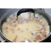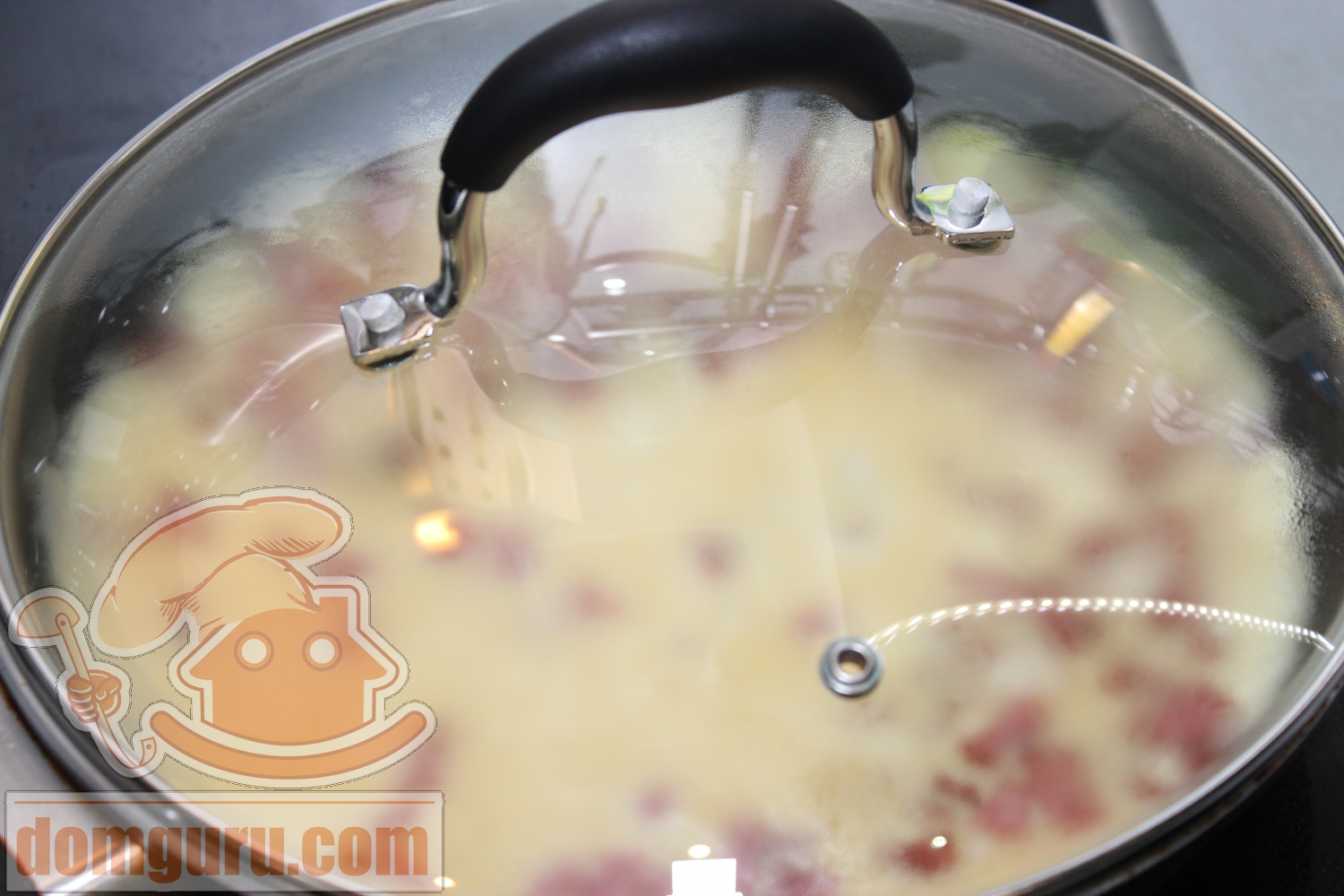 Накройте крышкой и убавьте огонь. Жарьте омлет на среднем огне.