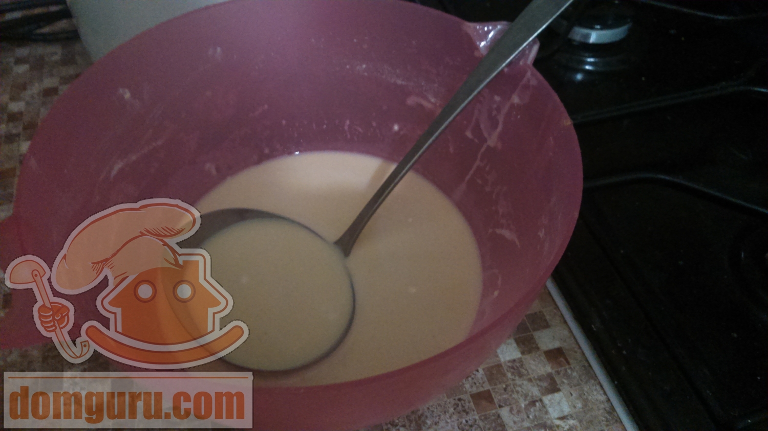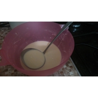 Молоко разделите на две равные части. В одну часть разбейте яйца, добавьте сахар, соду и соль, всё тщательно перемешайте. Муку добавляйте по чуть-чуть, чтобы получилась не очень густая масса. Вторую половину молока нагрейте, вылейте в первую половину и перемешайте.