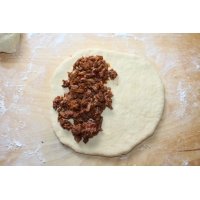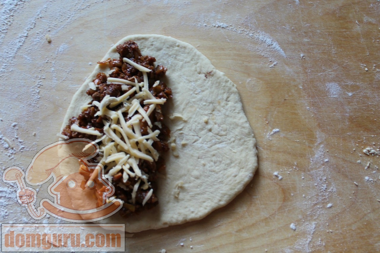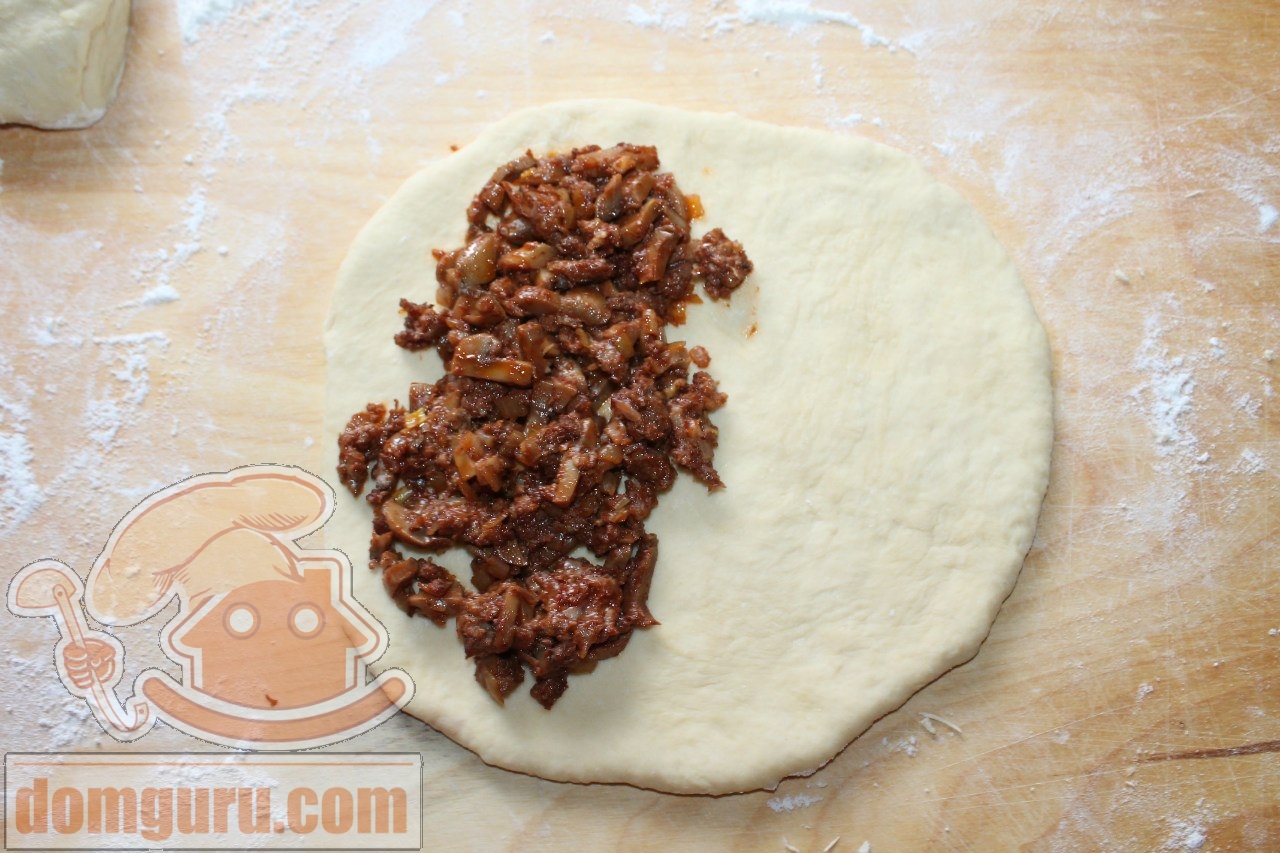 Для начинки лук порежьте кубиками, чеснок — пластинками. Поджарьте лук и чеснок до полуготовности. Добавьте порезанные пластинками шампиньоны, прожарьте 1 минуту. Добавьте фарш. Потомите под крышкой 7-8 минут.Добавьте томатный соус, соль, перец. Перемешайте.Тесто разделите на 2 части. Раскатайте каждую в круг толщиной 0,7 см. С одной стороны выложите начинку.
