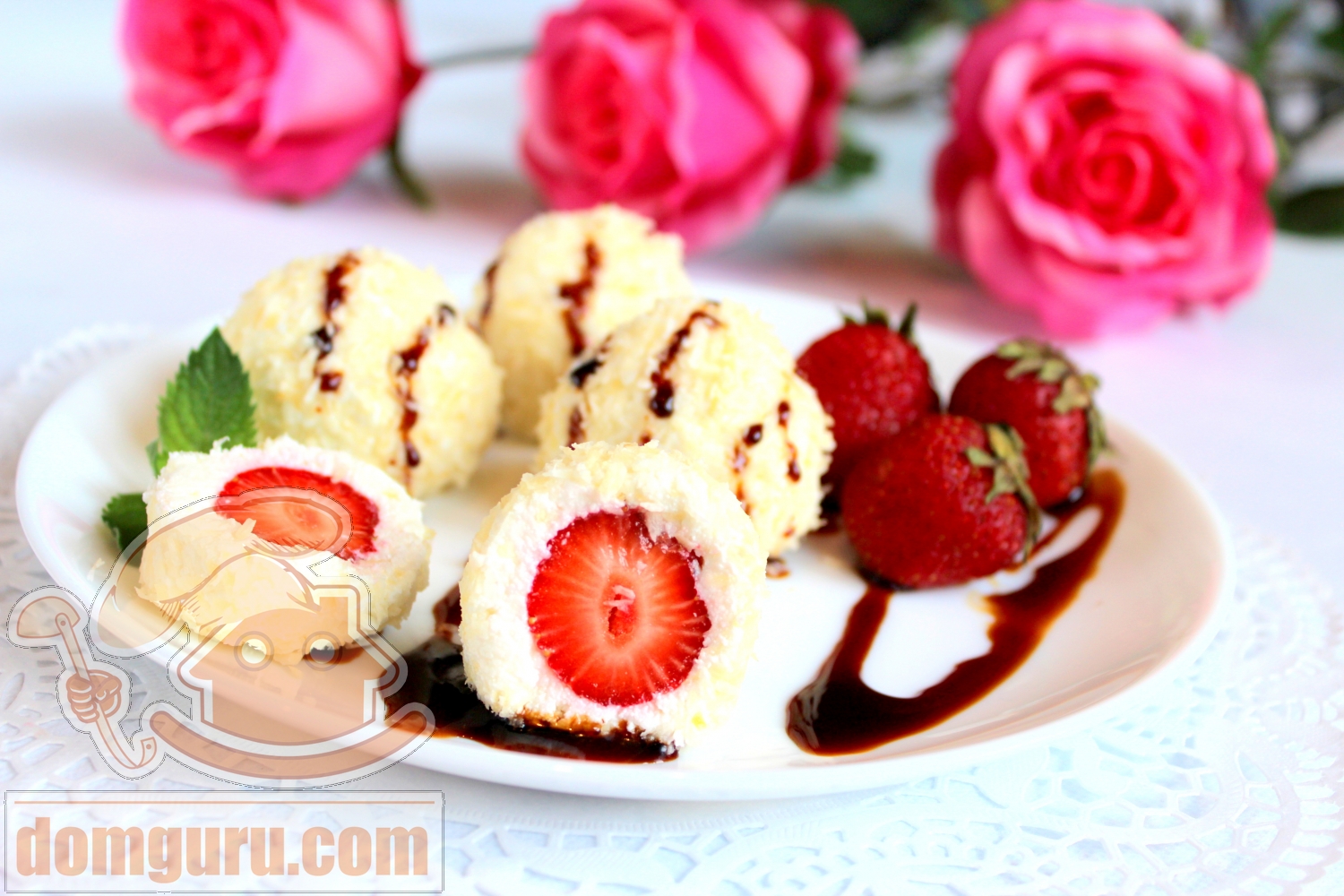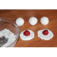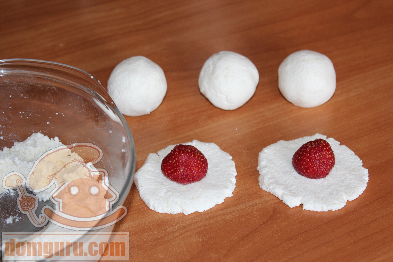 Из творожной массы сделайте лепешку, в середину положите одну клубничку и сформируйте шарик.