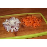 Мелко нарежьте лук. Морковь натрите на крупной терке. Добавьте овощи к мясу. Тушите еще минут 15.