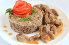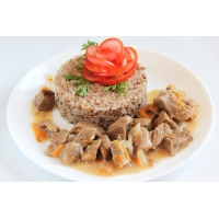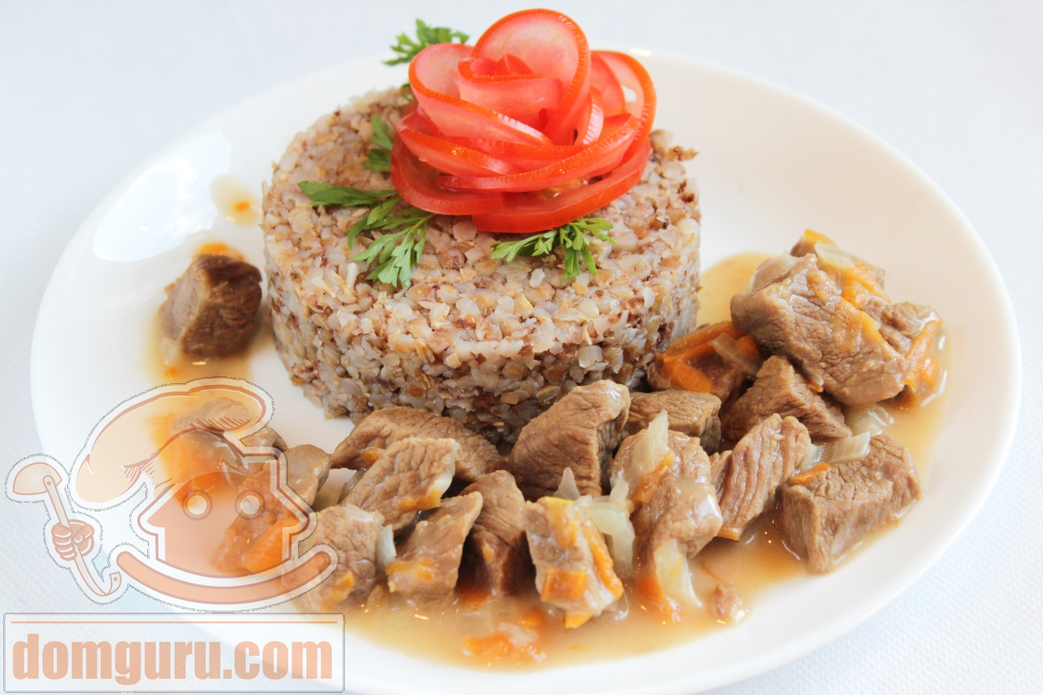 Подавайте гуляш из говядины в горячем виде с любым гарниром, например, с гречкой.