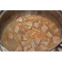 Мясо нарежьте небольшими кусочками, положите в сотейник. Добавьте 1 стакан воды. Тушите 1-1,5 часа.
