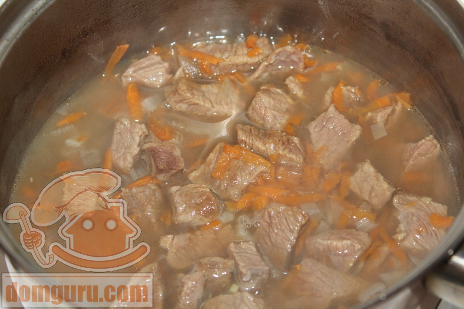 Следите за количеством бульона, мясо должно быть им слегка прикрыто. Посолите и поперчите по вкусу.