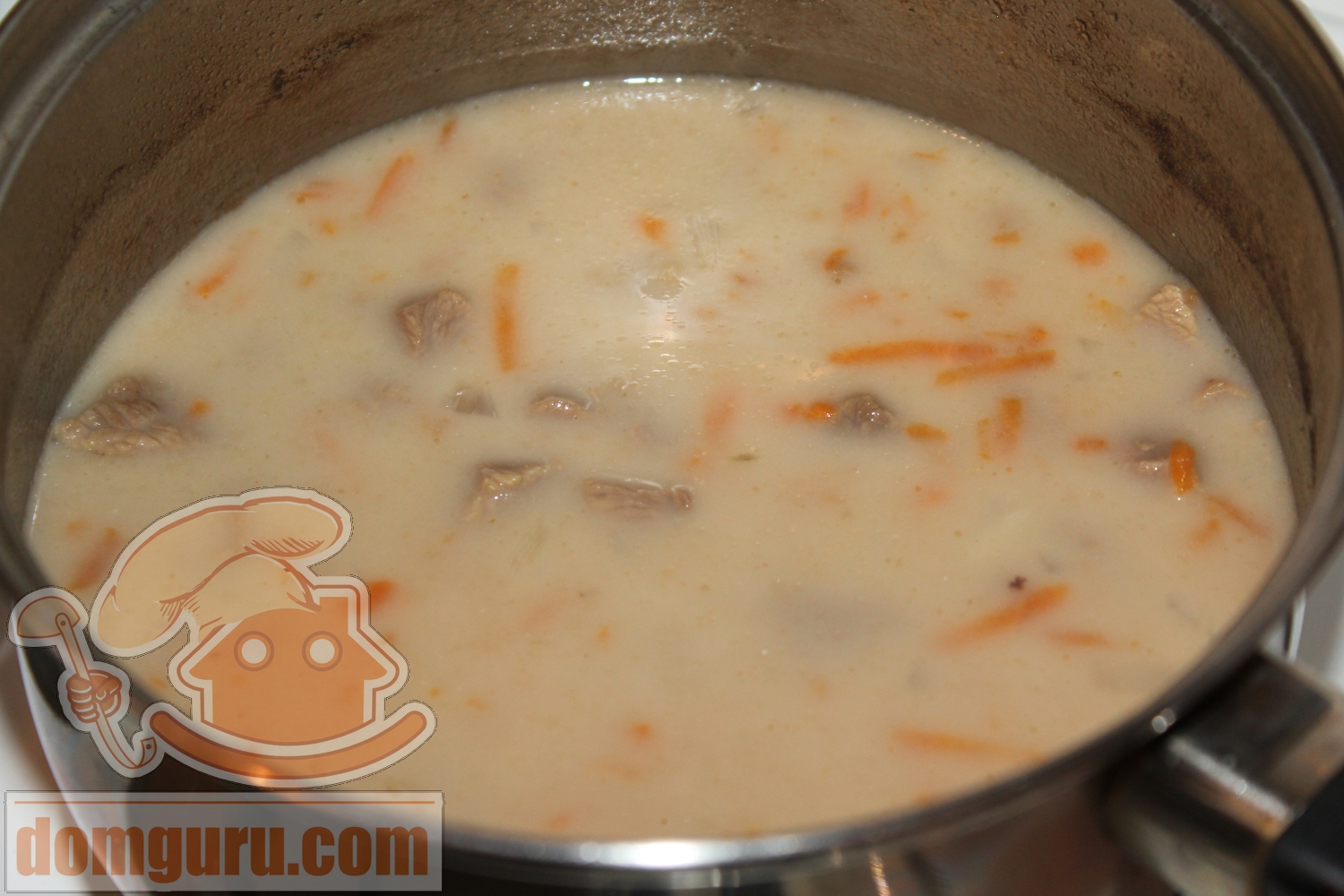 Непрерывно помешивая гуляш, влейте туда смесь из сметаны, томатной пасты и муки. Потушите еще минут 5-10.