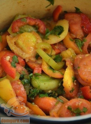 Порежьте помидоры пластинками или кусочками, перец нашинкуйте соломкой. Чеснок раздавите. Смешайте ингредиенты, добавьте уксус, масло, соль, сахар, перец, приправу для моркови по-корейски. Поставьте ёмкость с помидорами на 8 часов в холодильник.
