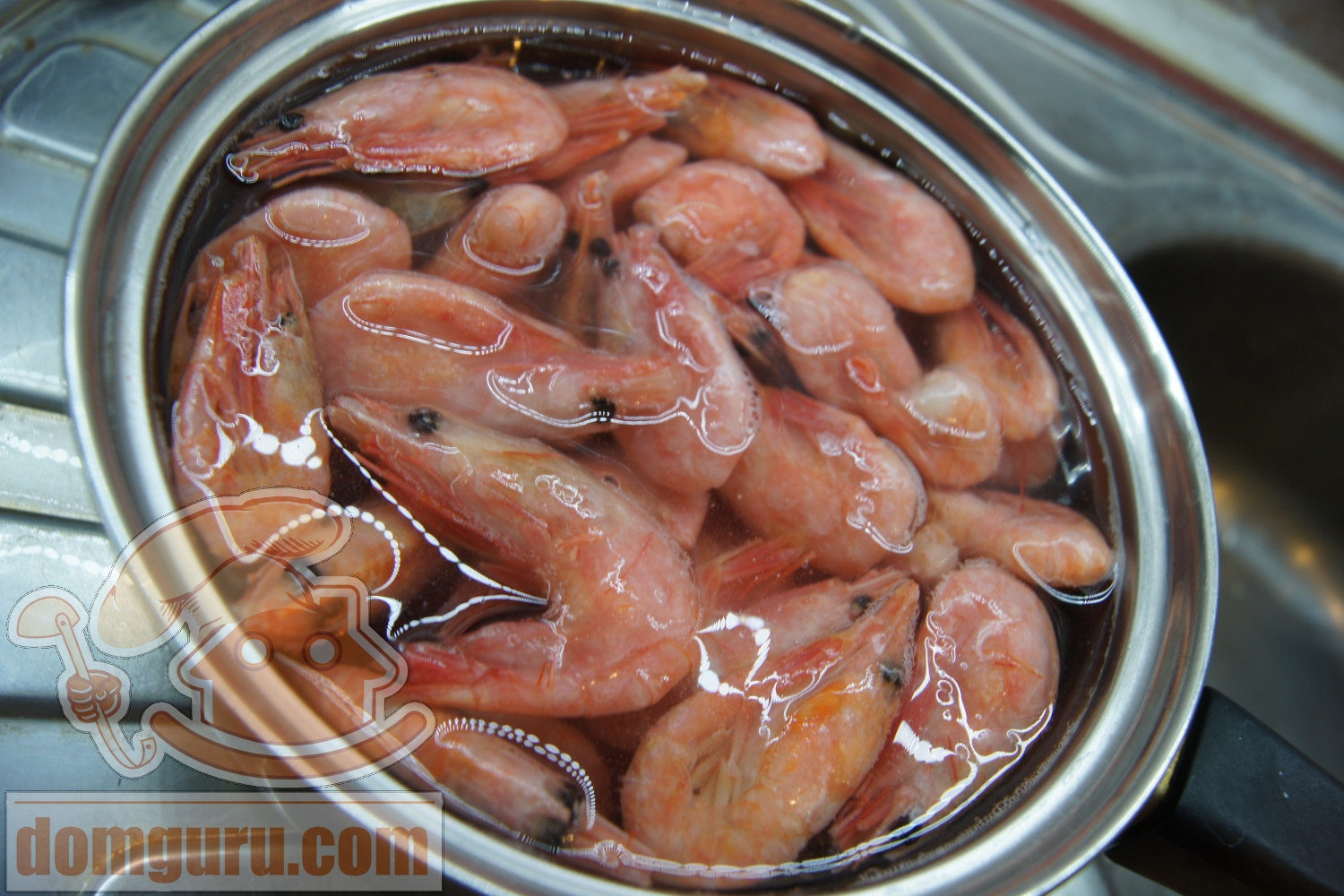 Сперва разморозьте креветки. Их можно оставить при комнатной температуре до полного оттаивания или поместить в прохладную воду для ускорения процесса.