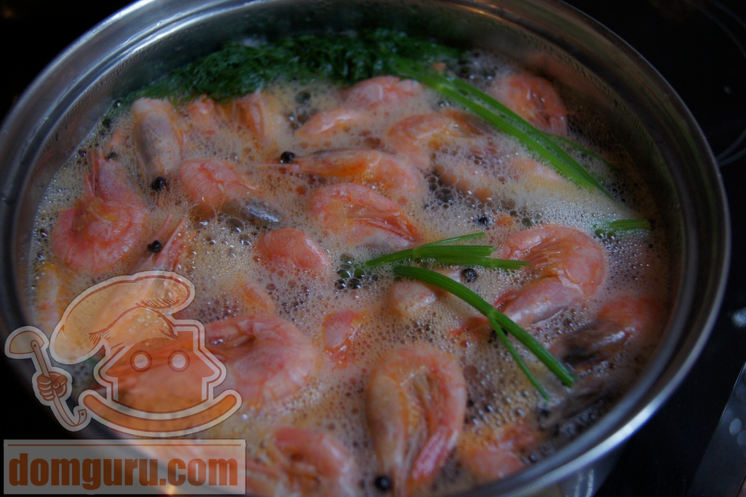 Когда креветки хорошенько прогреются, именно прогреются, а не сварятся, то отбросьте содержимое кастрюли в дуршлаг. Дайте стечь отвару, удалите укроп.