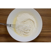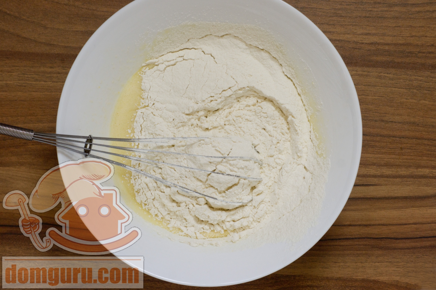 Просейте с миску с тестом пшеничную муку, соединенную с разрыхлителем. Перемешайте.