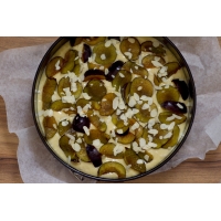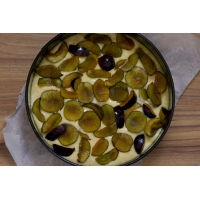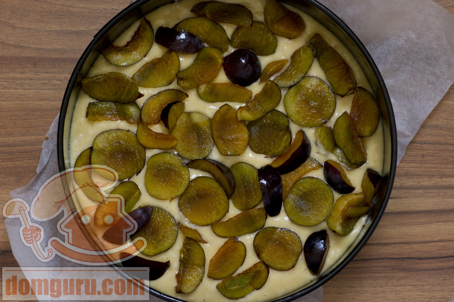 Тесто поместите в форму, дно которой застелено пергаментной бумагой, а бортики смазаны сливочным маслом. Сверху выложите кусочки слив.