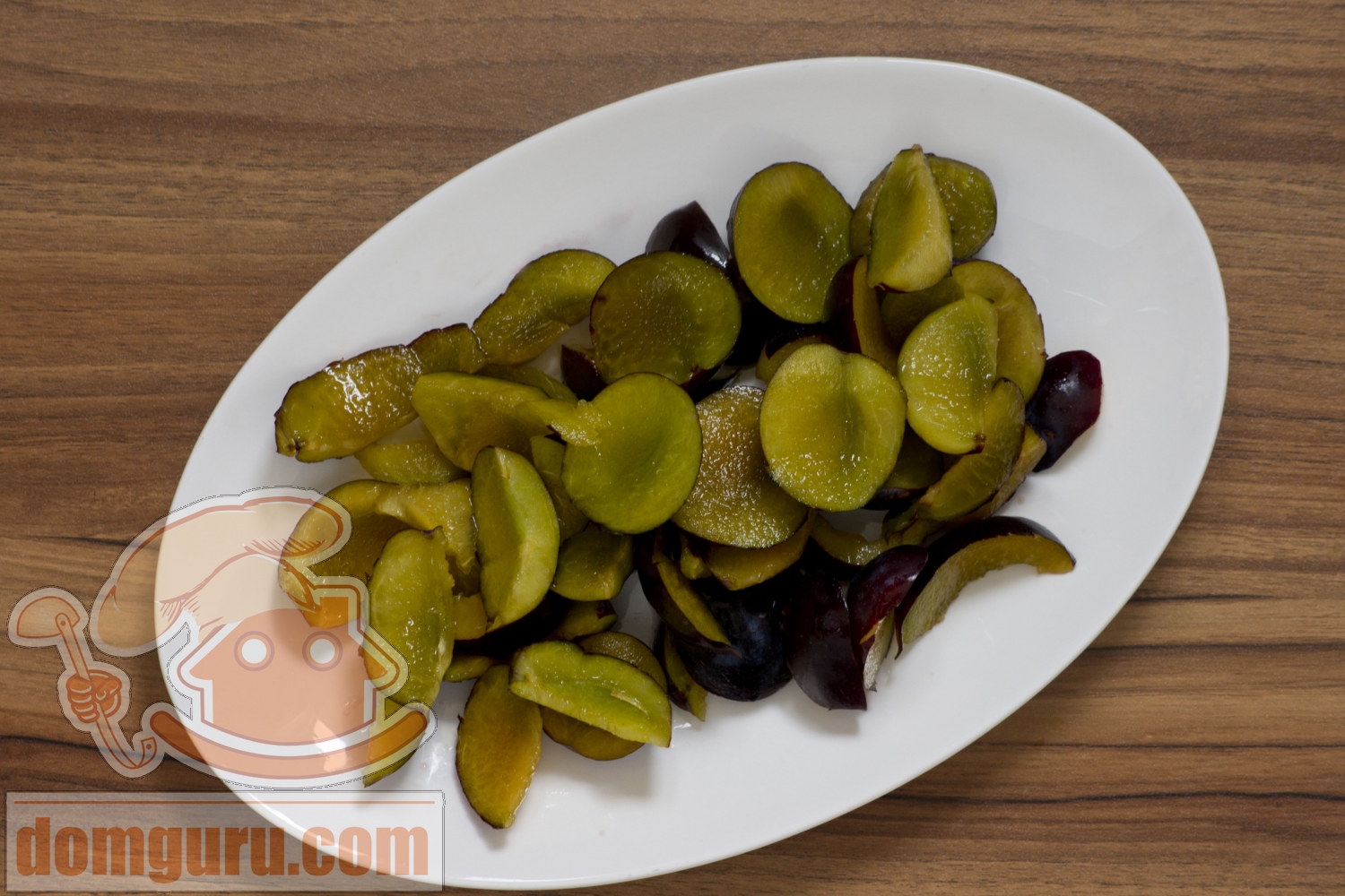 Заранее подготовьте сливы. Их нужно промыть и разрезать на ломтики, удаляя косточки и черенки.