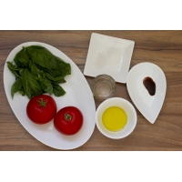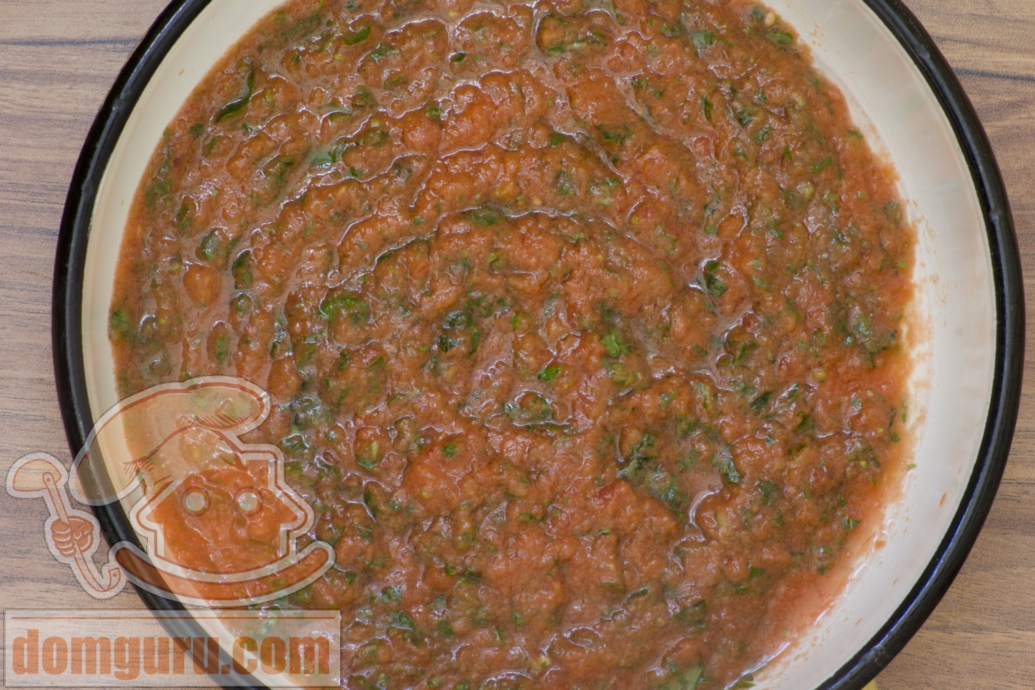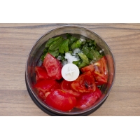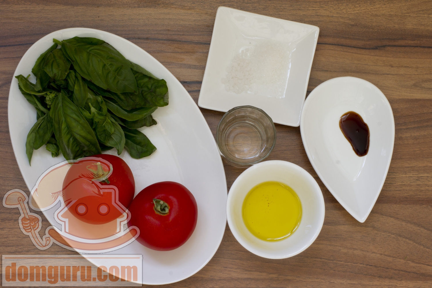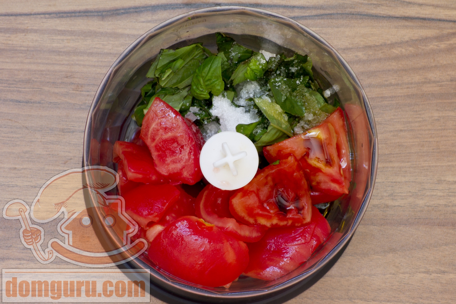 Поместите кусочки помидоров в блендер, добавьте чистые листочки свежего базилика (стебли не добавлять), соль-сахар-перец, оливковое масло, бальзамический уксус. Измельчите.